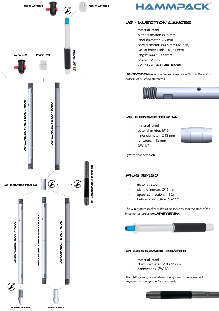 Hammpack JG-SYSTEM injection lances, with 500mm and 1000mm solid and perforated section lengths. Balanced injection surface structure for both cement suspensions, geopolymers, acrylic gels and polyurethane resins.
