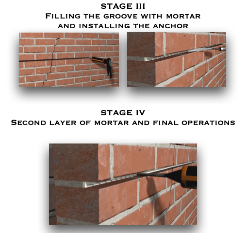 Seuraava vaihe on täyttää ura ensimmäisellä noin 10 mm paksulla laastikerroksella ja asettaa siihen aiemmin leikattu ankkuri.